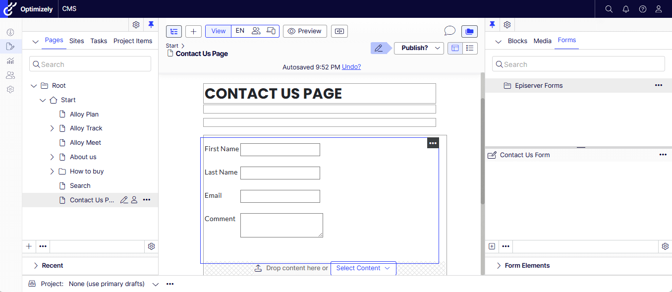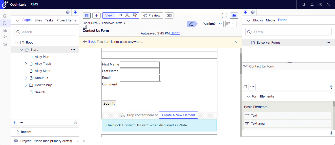 - Drag and drop the newly created Form into the Content Area.